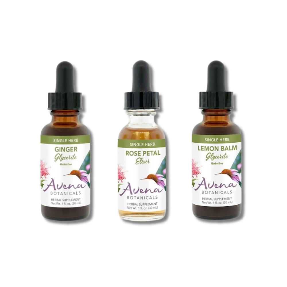 Avena Botanicals: Ginger Glycerite Tincture, Lemon Balm Glycerite Tincture and Rose Petal Elixir Glycerite Tincture